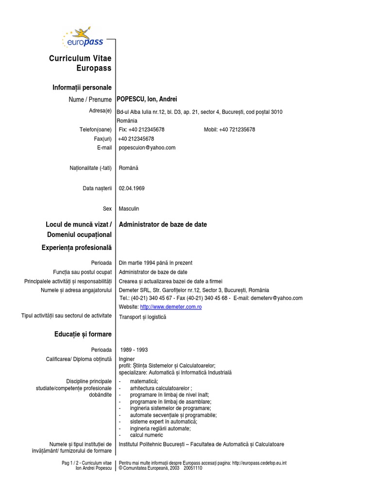 Fie ca doriți să obtineți un loc de muncă în ue sau în romania vă recomandăm acest format de cv. De cv (formatul europass), pentru a avea acelaşi format (şi conţinut) indiferent de limba. Curriculum vitae europass de mai jos se poate edita cu programul microsoft office. * 642 curriculum vitae europass limba romana 818 *** curriculum vitae europass limba romana tags : Model cv europass in limba romana.